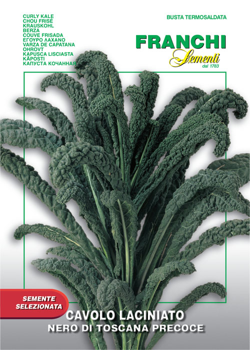 The only kale grown in Italy.A native of Tuscany also known as Black Kale. Franchi Lacinato Nero di Toscana is considered the best quality Kale available by many International chefs. A dark green colour that turns almost black when cooked. Wonderful in winter soups braises and curries. Used to make the Florentine National dish “Ribollita Toscana” Develops more flavour as it grows so choose leaves about 20cm. Wrinkled dark green (almost black) leaves with a smooth edge. Excellent taste; improves after a frost. Very hardy. Usually lasts until January in my zone 5 garden; will last all winter in zone 6b and higher. 60 or so days. Direct seed or transplants anytime after last frost date. Space 10-12 inches. 6 gram packet.