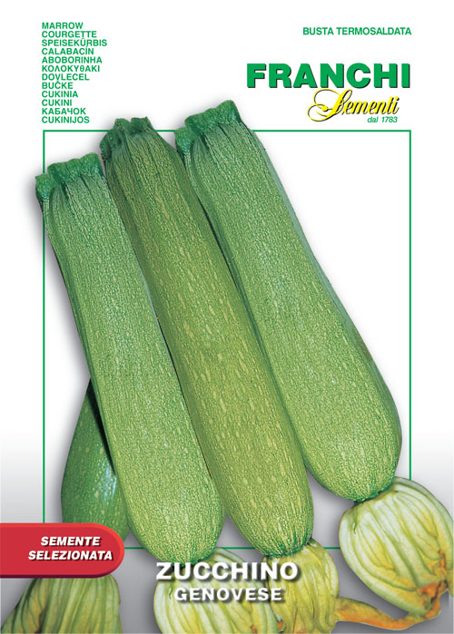 Zucchini Genovese. Light green fruit. No ribbing. Very nice flavor. Can be started from seed or transplants for faster fruit. Large plant, good producer of many fruits and blossoms. 55 days.8 gram packet.