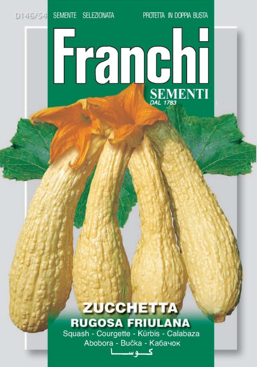 Zuchetta rugosa friulana — Wrinkled from Friuli. These produce an abundance of light yellow, "warty" fruit. Actually, they are pretty ugly but they taste very good and the flowers hold extremely well. This is the most common zucchini in the markets of Venice in summer. 5 gram packet.