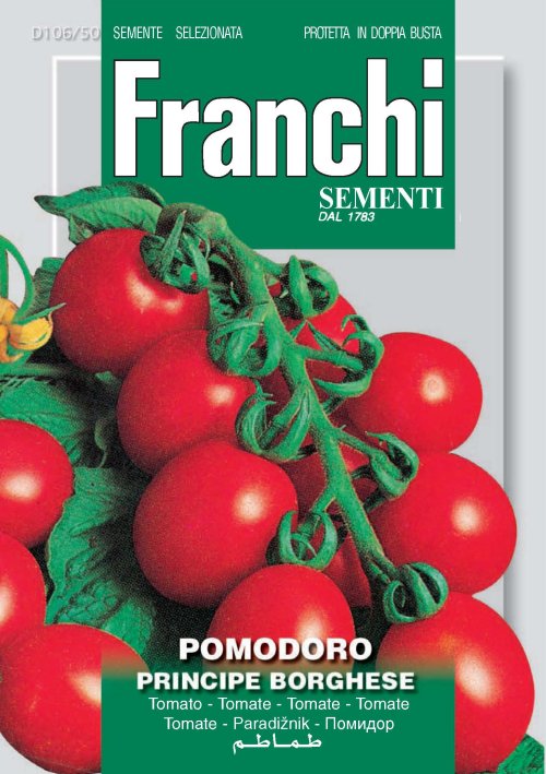 Small indeterminate plants bear prolifically and must be staked or caged. Tomatoes set on clusters of 7-10 fruit each weighing about 2 oz. They hold extremely well on the vine. 72 days. Eat fresh in salad or dry for sun-dried tomatoes. Principe Borghese is often called 'da appendere' (and Eternal tomatoes) or to hang. Italians often keep them after the season by hanging them upside down when still green in a open area like a barn and store them well into the winter months. 1.5 gram packet.